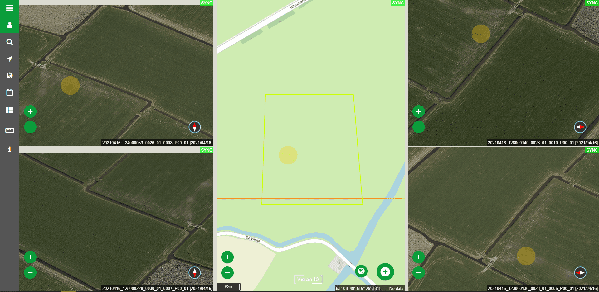 An oblique photo is delivered in .tif or .jpeg format together with the corresponding photo location. This makes it possible to view the obliek photos in a GIS environment. Obliek photos are often taken together with an orthophoto.